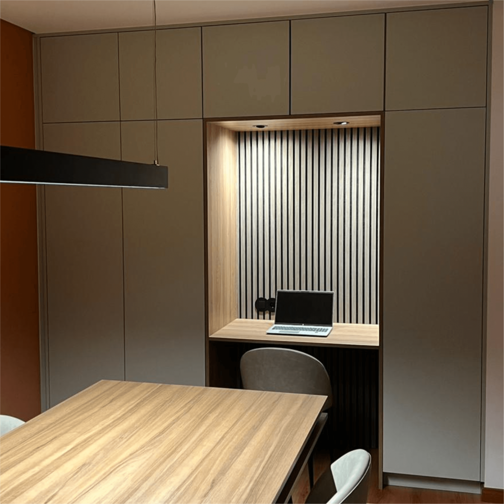Sim, trabalhamos com lacagem de alta qualidade aplicada em frentes, painéis e portas de vidro, garantindo superfícies lisas, núcleos consistentes e um acabamento rigoroso que valoriza, armários e salas em projetos de interiores de padrão elevado.